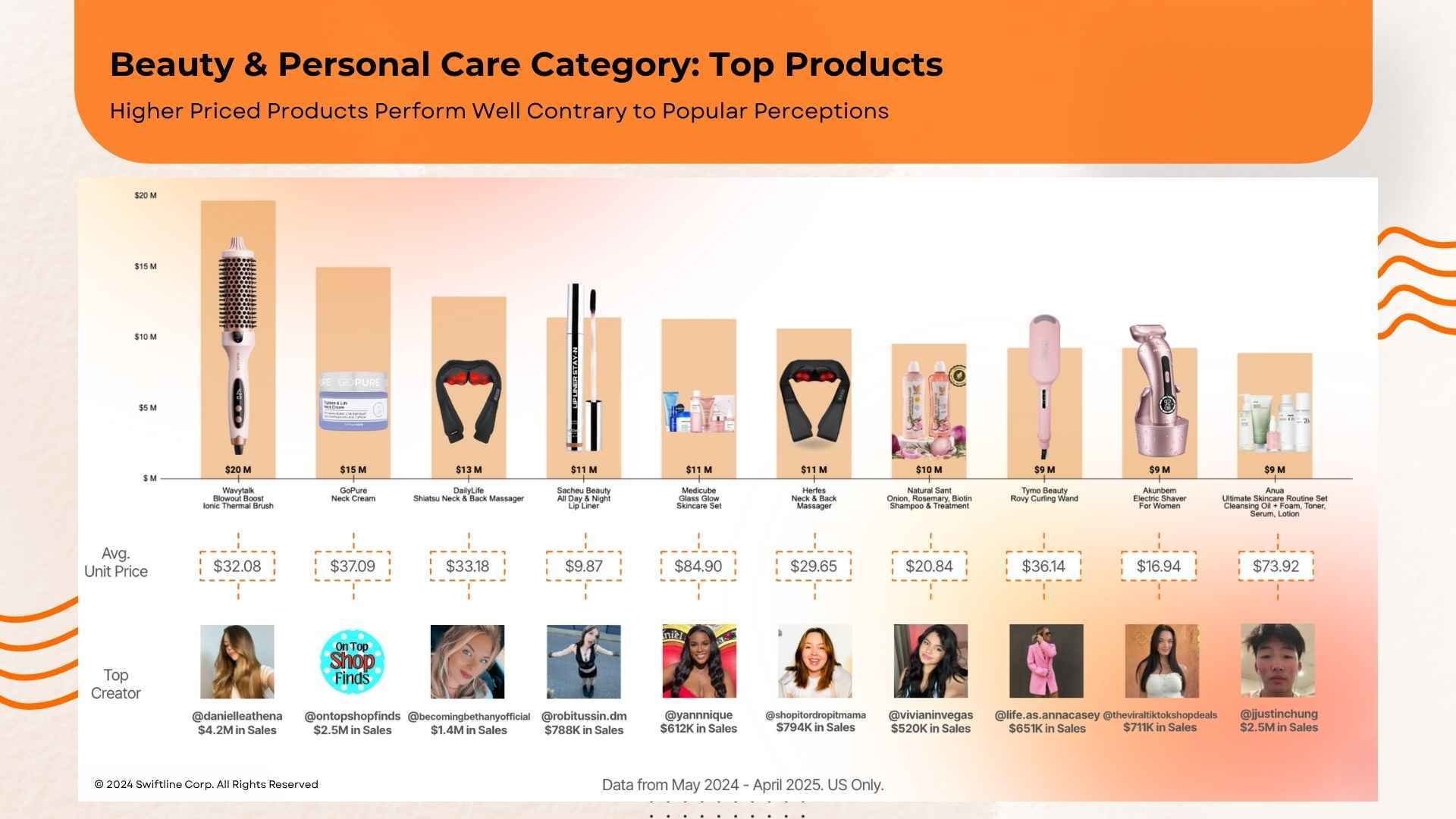 These ten products garnered the highest revenue in the Beauty & Personal Care category on U.S. TikTok Shop from May 2024 to April 2025. From hair tools and skincare sets to massage devices and lip liners, each product earned its spot through strong creator content, compelling demos, and high purchase intent.